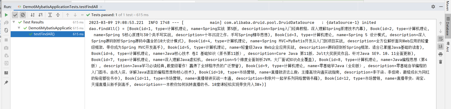 class Demo6MybatisApplicationTests {@Autowiredprivate BookDao dao;@Testvoid testFindAll() {System.out.println("dao.findAll() = " + dao.findAll());}