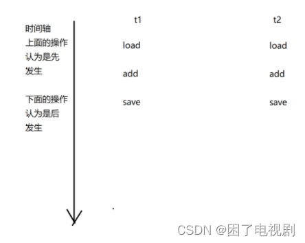 在分析上大概是这种,我们的理想情况是t1线程执行完后,再执行t2线程,然后t2线程完整的执行完后在执行t1线程,但是在真实的计算机内部并不是这样的,由于线程的并发执行,这就导致一个count++代码可能并没有执行完就切换到另一个线程去了,这就导致了很多种不确定的情况,比如这种: