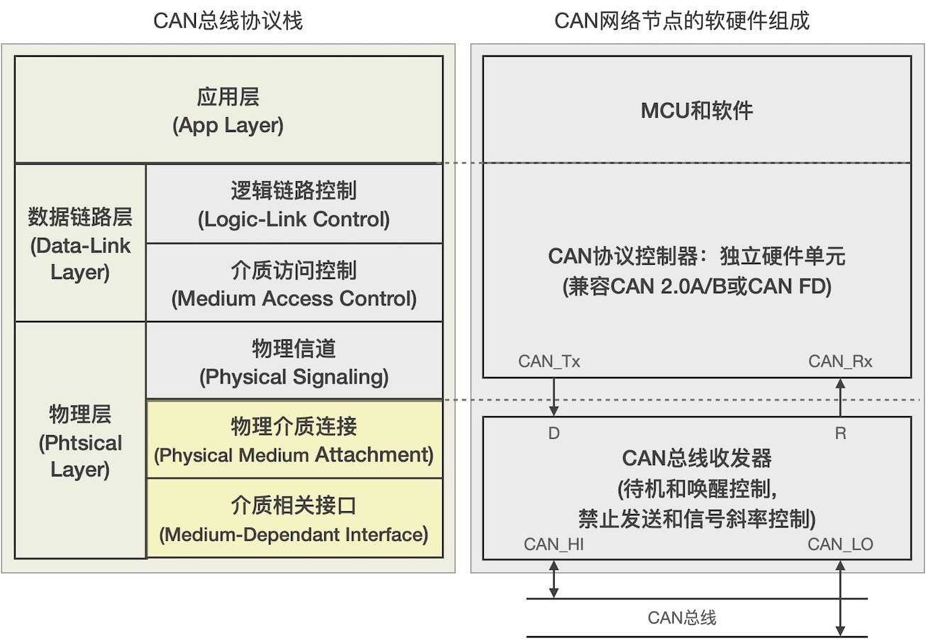MAC子层和LLC子层,MAC 子层是 CAN 协议的核心部分。数据链路层的功能是将物理层收到的信号组织成有意义的消息,并提供传送错误控制等传输控制的流程。具体地说,就是消息的帧化、仲裁、应答、错误的检测或报告。