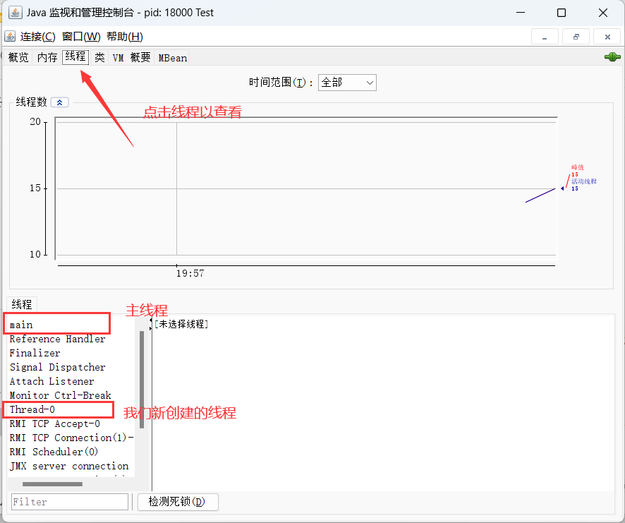public static void main(String[] args) {Thread t = new Thread() {@Overridepublic void run() {while(true) {System.out.println("hello Thread");try {Thread.sleep(1000);} catch (InterruptedException e) {e.printStackTrace();}}}};t.start();while(true) {System.out.println("hello main");try {Thread.sleep(1000);} catch (InterruptedException e) {e.printStackTrace();}}}【其他技巧】我们如果要观察线程,我们可以打开C:\Program Files\Java\jdk1.8.0_192\bin下面的jconsoles中查看(我们必须启动main线程,必要时以管理员身份运行)