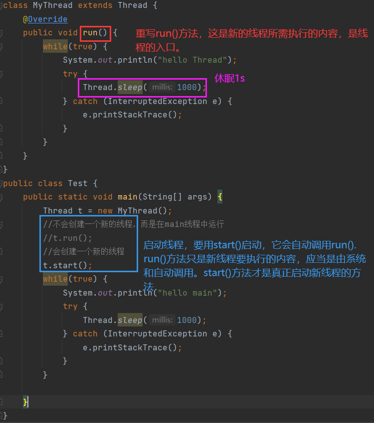 class MyThread extends Thread {@Overridepublic void run() {while(true) {System.out.println("hello Thread");try {Thread.sleep(1000);} catch (InterruptedException e) {e.printStackTrace();}}}