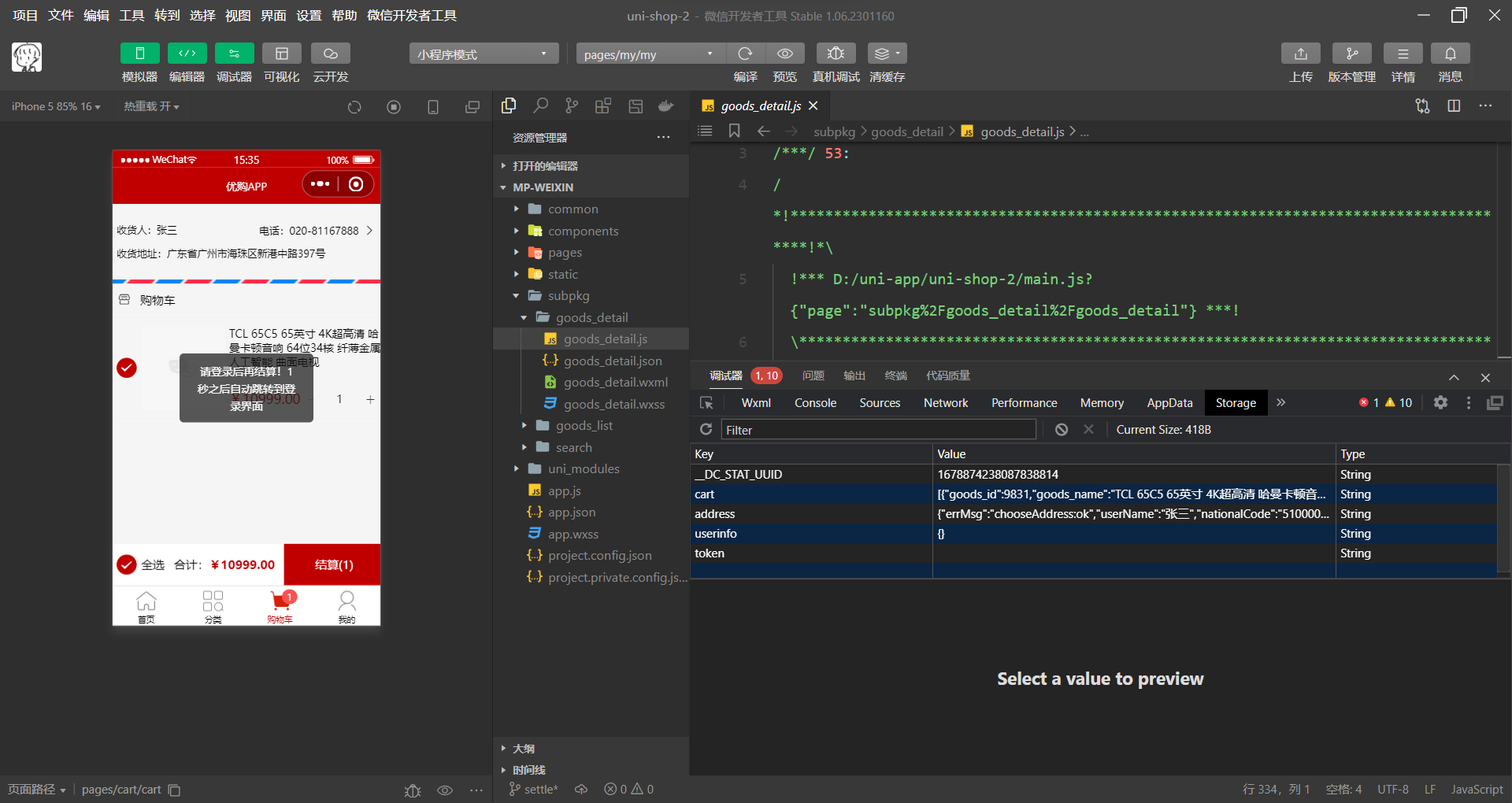 settlement() {// 1. 先判断是否勾选了要结算的商品if (!this.checkedCount) return uni.$showMsg('请选择要结算的商品!')// 2. 再判断用户是否选择了收货地址if (!this.addstr) return uni.$showMsg('请选择收货地址!')// 3. 最后判断用户是否登录了,如果没有登录,则调用 delayNavigate() 进行倒计时的导航跳转// if (!this.token) return uni.$showMsg('请先登录!')if (!this.token) return this.delayNavigate()