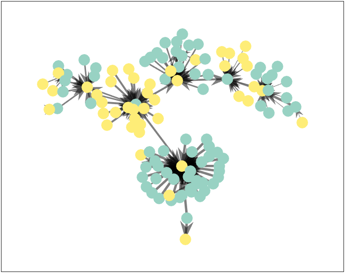 换言之,每个网页的排名很大程度上基于与之链接的网页的排名。项 A’*(r./d) 会挑选出链接到图形中每个节点的源节点的得分,而得分按这些源节点的出站链接总数进行归一化。这确保了 PageRank 得分的总和始终为 1。例如,如果节点 1 链接到节点 2、3 和 4,则它会在算法的每次迭代期间向其中的每一个节点传送 1/3 的 PageRank 得分。